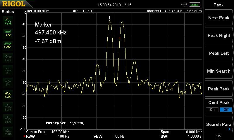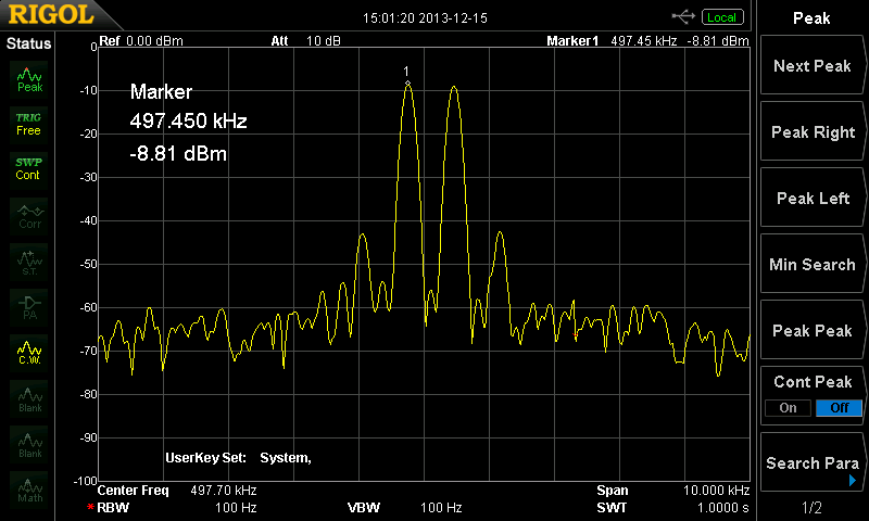 Теперь про интермодуляцию в полосе пропускания. Тоже много разных мнений читал, проверим, что даёт практика. Подаём сигнал, соответствующий действующему напряжению на пике огибающей в первичной обмотке 500 мВ, попадающий в полосу пропускания ЭМФ (497.3 и 498 кГц)