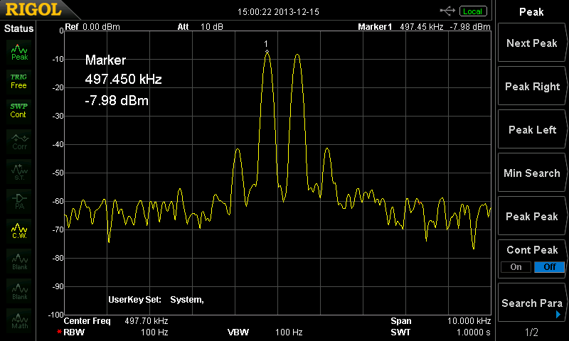 Теперь про интермодуляцию в полосе пропускания. Тоже много разных мнений читал, проверим, что даёт практика. Подаём сигнал, соответствующий действующему напряжению на пике огибающей в первичной обмотке 500 мВ, попадающий в полосу пропускания ЭМФ (497.3 и 498 кГц)