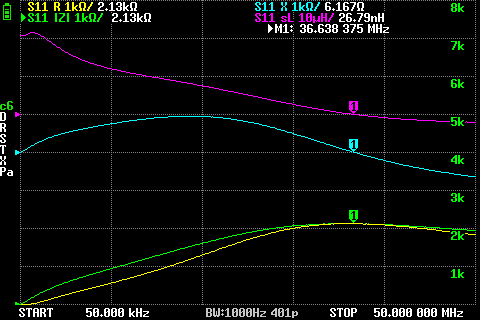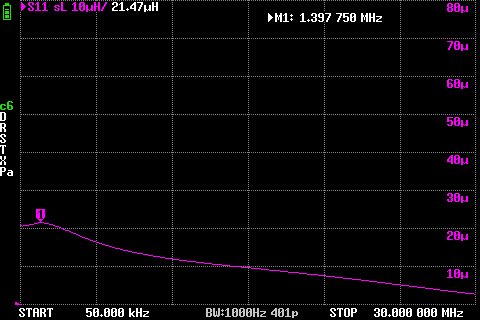 Еще мои картинки, тоже заметно, но тут калибровка от 50кГц, ниже не стал показывать, суть та же. Есть горбик тоже, а потом дальнейшее падение индуктивности в ноль к частоте собственного резонанса обмотки (светло-синяя линия - резонанс пересекает ноль где стоит маркер, левее икс положительный, правее в минус ушел), а фиолетовый цвет - индуктивность.  Вроде как "по-букварю".