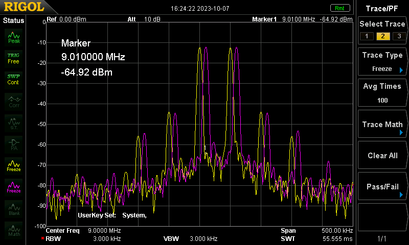 На скрине ниже проверка третьего каскада сильносигналки 0132, на входе 2*200 мВ, с выхода сигнал снимается на 50-омный вход анализатора через 200 Ом - фактически, тот же режим, что и по жизни в схеме.  1yep
